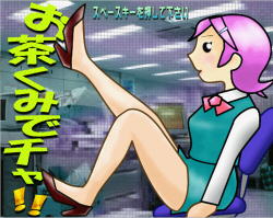 「お茶くみでチャ!!」画像です。当作品を紹介していただく場合は下に表示してある画像を保存して使って頂いて構いません。 画面左の画像は「250x200」・右の画像は「114x90」です。 「250x200」お茶くみでチャ!!(通常版) 「114x90」タイトル画面 幽霊社員 無念〜 お茶くみでチャ!!Ver+(アレンジ版) Ver+のタイトル画面 マッチョの脱衣シーン 強敵お局とエロ部長 ダンボールと自販機